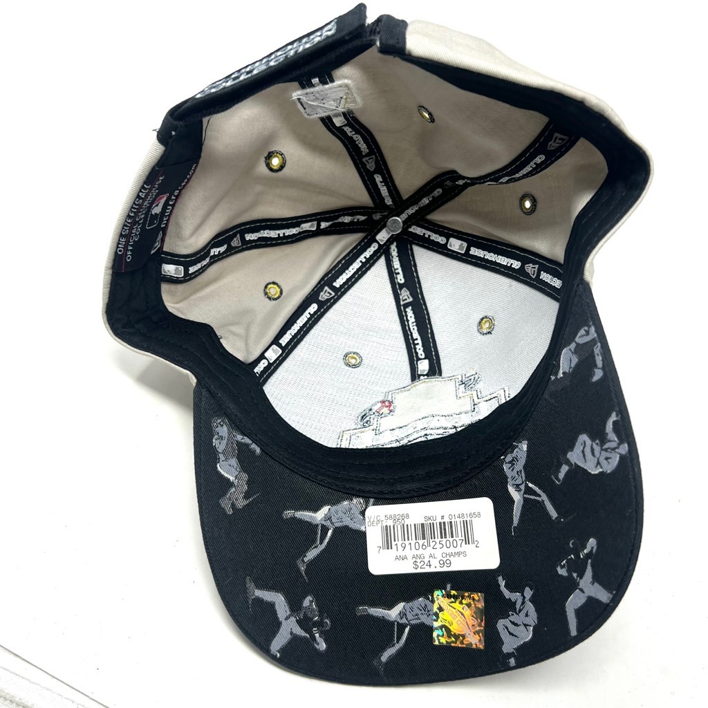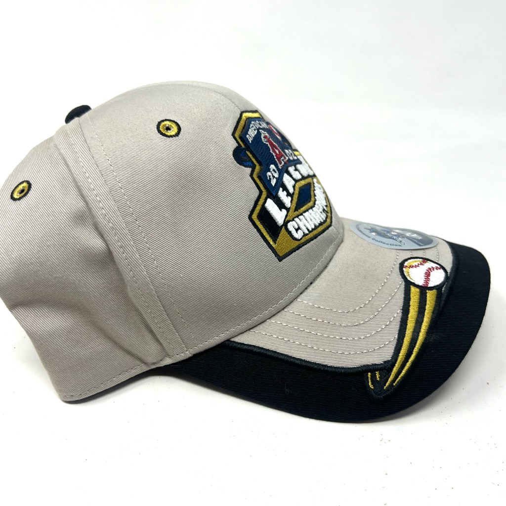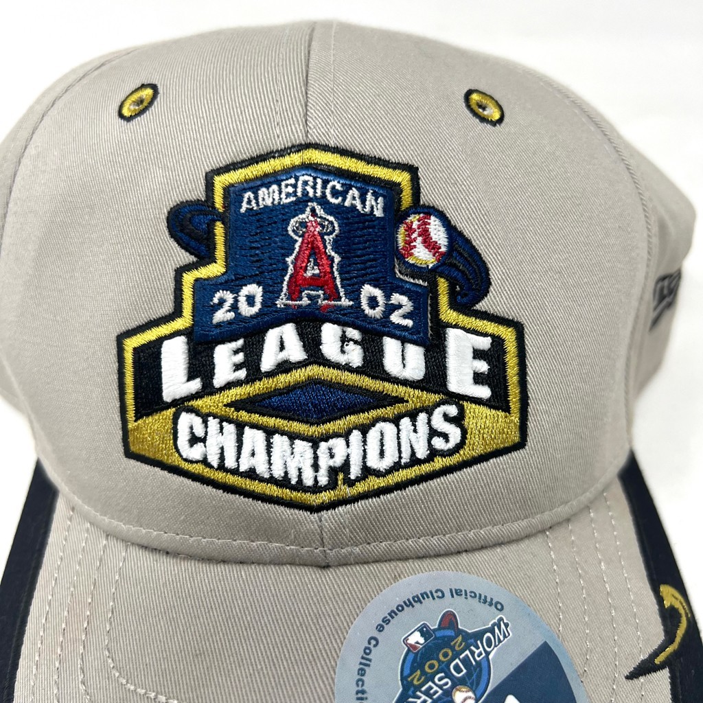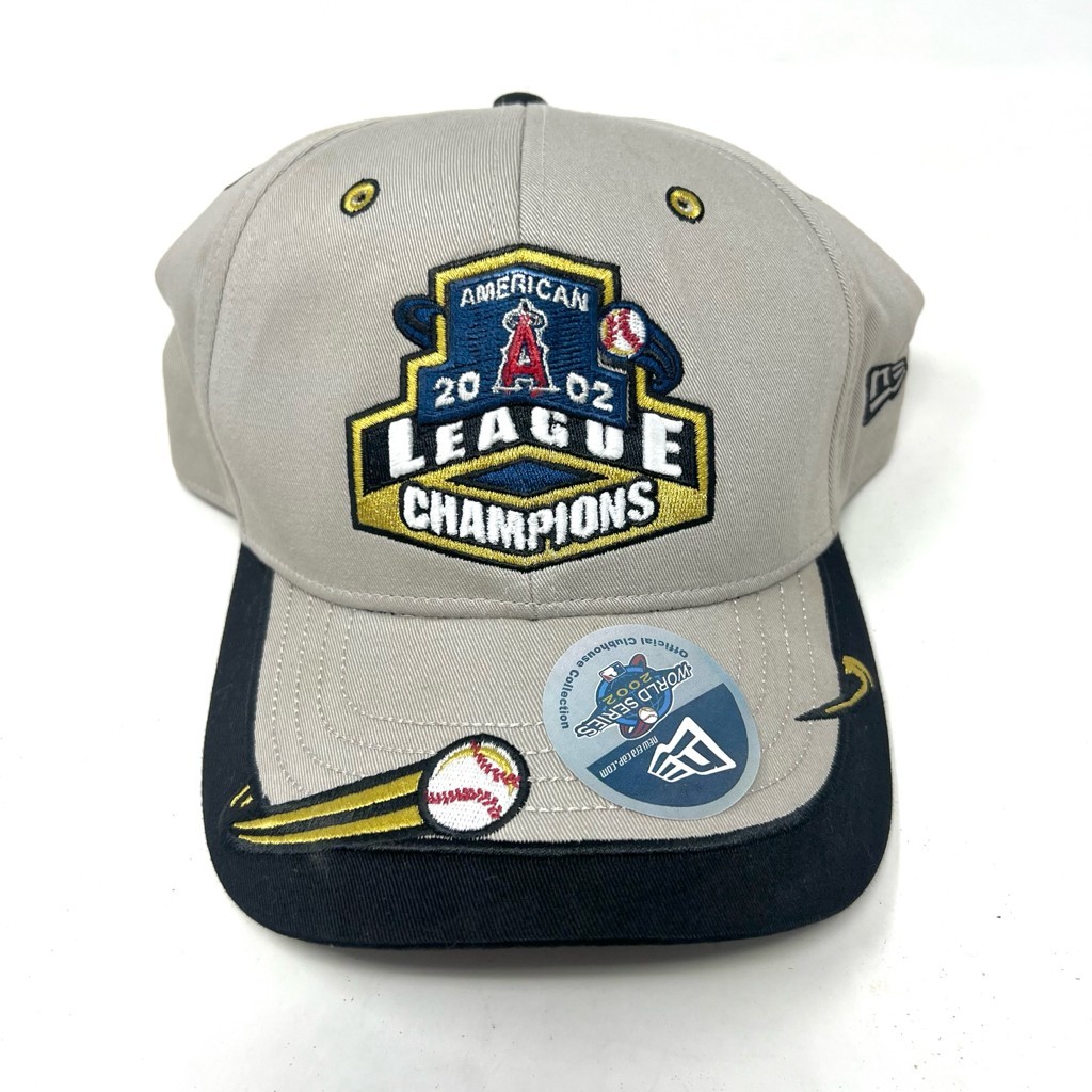 Celebrate a piece of Major League Baseball history with this pristine, vintage Anaheim Angels 2002 American League Champions Hat. Manufactured by New Era, a brand synonymous with quality headwear, this cap stands as a testament to the Angels' triumphant season. The main body of the hat is constructed from high-quality fabric in a classic gray color, offset by a contrasting navy brim that exudes timeless style. A vibrant, detailed embroidery adorns the front, featuring the American League Champions logo complete with the Angels' iconic 'A' and the commemorative year 2002, all embellished with accents in red, yellow, blue, and white thread. The left side of the hat is stamped with the New Era logo, signaling its authenticity and brand prestige. Additional embroidered patches and branding may be present that showcase the hat's exclusive edition nature and collectibility.
