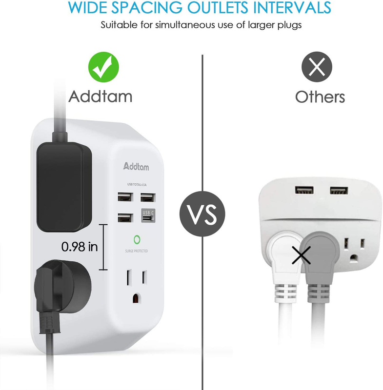 Keeps Devices Safe from Surges and Spikes. When bad weather knocks out your home?s power or an unexpected surge or spike occurs, Addtam protector is your first line of defense. This safety-regulated, flat wall tap built-in LED light that indicates when your devices are protected and wiring properly grounded.