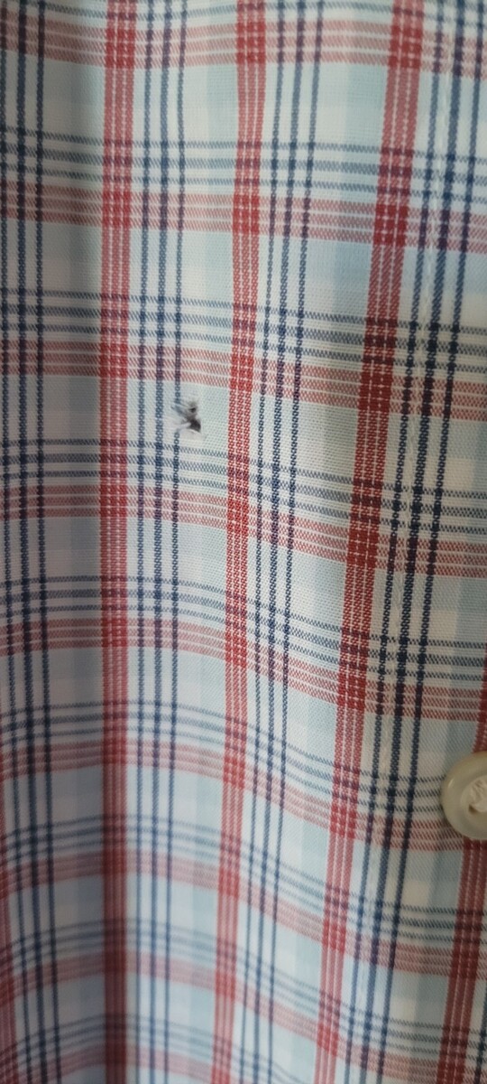 This shirt is in good used condition. As seen in the photos, there is some discoloration on the collar, and there is a small hole. The size is medium. Measurements are approximately: Length: 27 inches. Pit to Pit: 24 inches. Sleeve:22 inches.
