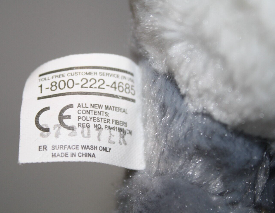 Soft gray and white plush material, Blue sewn eyes, Black plush nose, soft stuffed with no beans/pellets, wears a light blue rope collar with blue plastic heart charm, seam/tush tag intact, tuff of hair on top of head has been cut