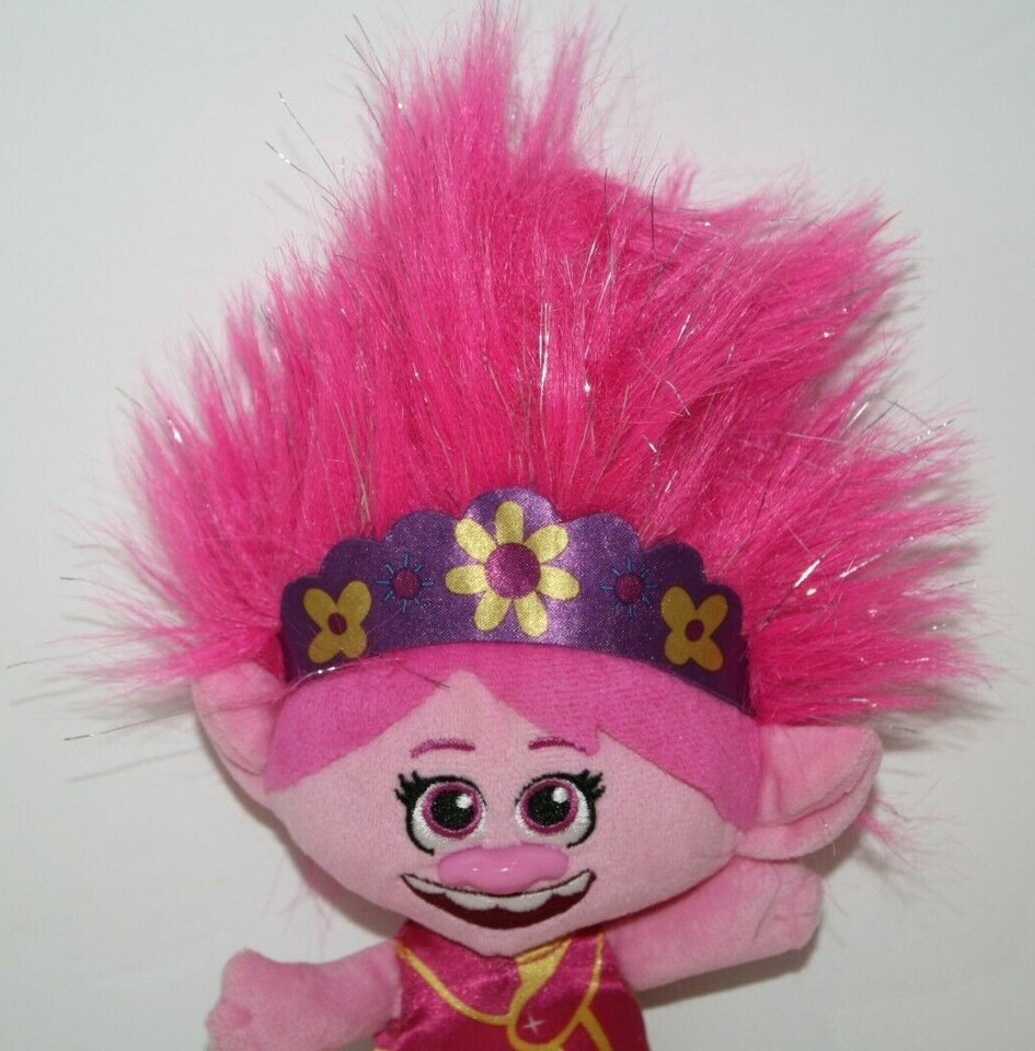 Trolls World Tour Poppy Doll Plush 9” Pink Yellow Dress Headband Glitter Hair