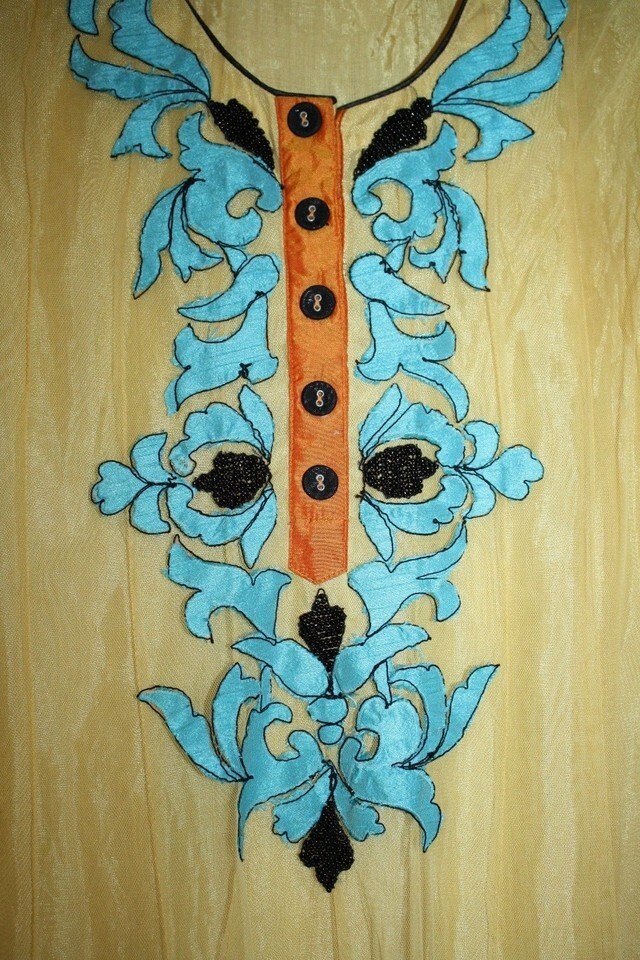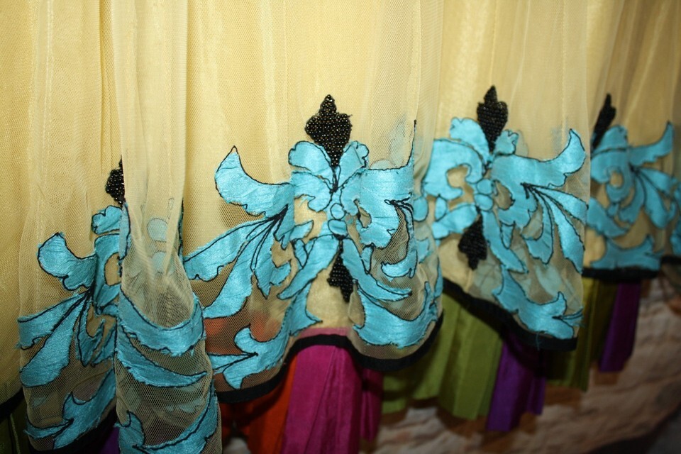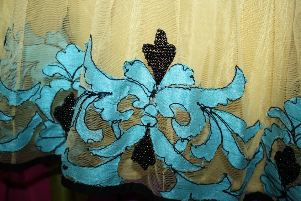 Vintage Festive Party Dress MEDIUM Yellow Gold Tulle Blue Overlay Beaded Pleated
