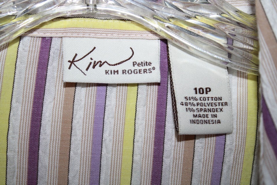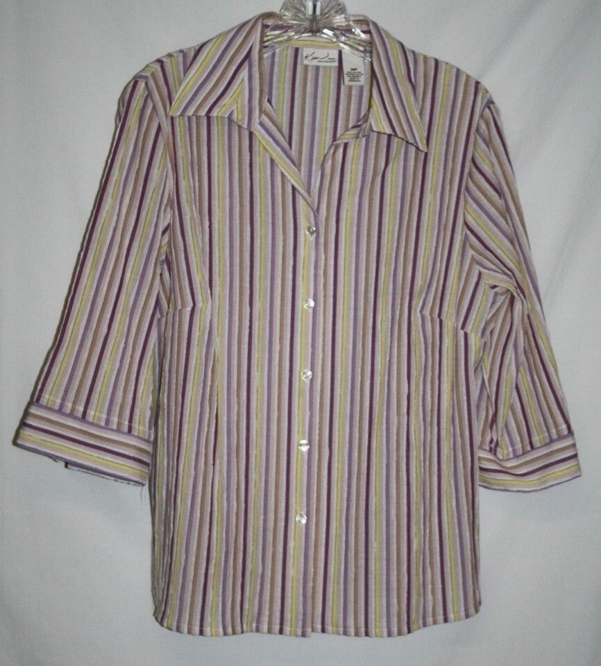 Kim Rogers, Petite 10P, Blouse, Purple, Yellow, Beige/Tan, White Striped, Button Up, 3/4 Sleeves