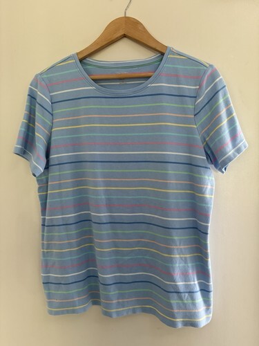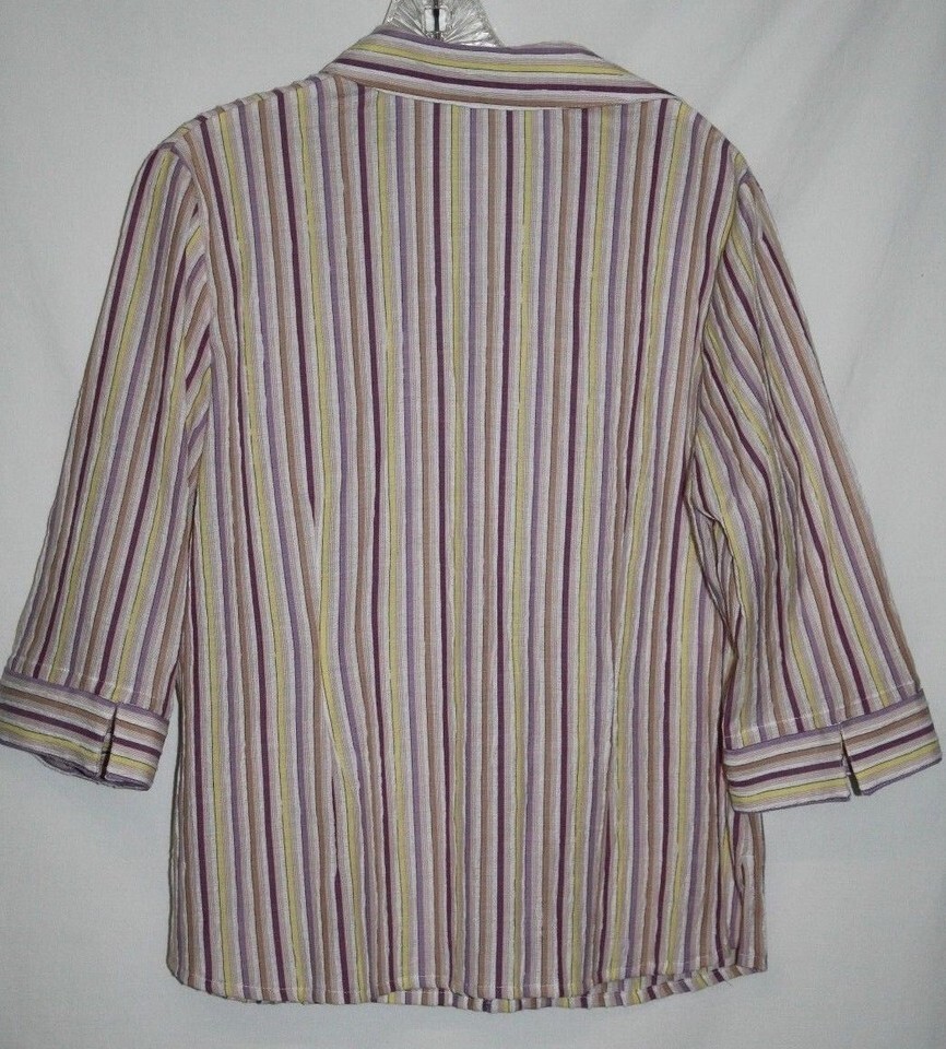 Kim Rogers Petite 10 P Blouse Top Purple Yellow Beige Striped Shirt 3/4 Sleeve