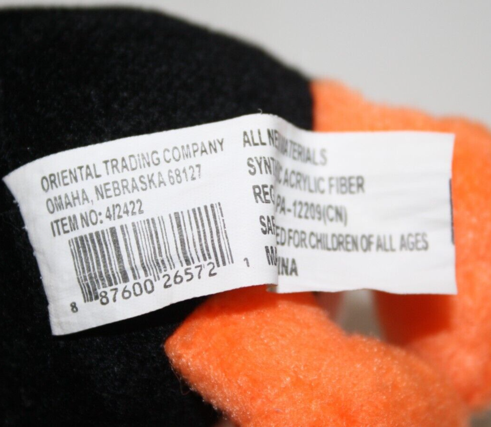Soft Black, White and Orange plush materials, plastic eyes and plush Orange nose, Soft stuffed, wearing a red and white Santa hat that is stitched on head, Seam tag intact