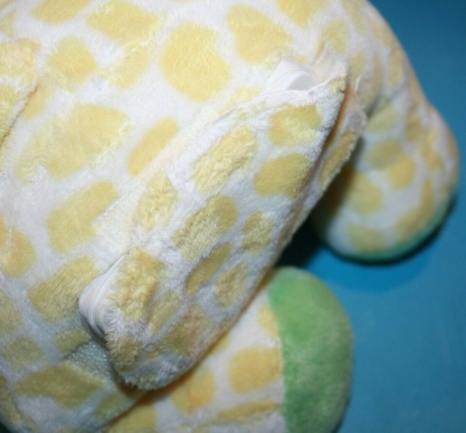 Features: Stuffed, Plush Giraffe sitting on a plastic base. Required 2 AA batteries, but Sound is Not Working. Tummy is a round plastic with cloth covering it. Soft plush with sewn eyes and nose.