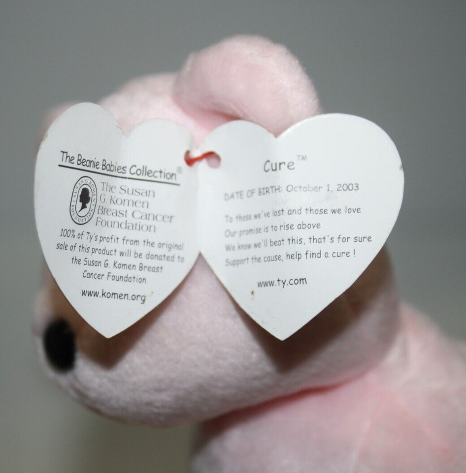 Condition: Adorable Pink Cure Breast Cancer Awareness Beanie Baby is clean, nice condition. Swing tag has a bend/crease from storage. Swing tag and Tush tag intact. Smoke-free environment