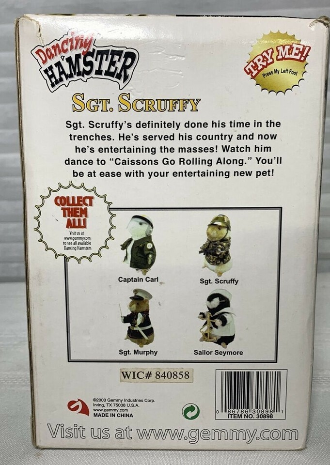 Introducing the Gemmy Dancing Hamster Sgt. Scruffy! This adorable battery-operated toy will delight fans of the Animaniacs character family, and collectors of unique toys from 2001. Made in China by Gemmy Industries, this dancing hamster is a must-have for anyone who enjoys quirky and fun electronic toys.