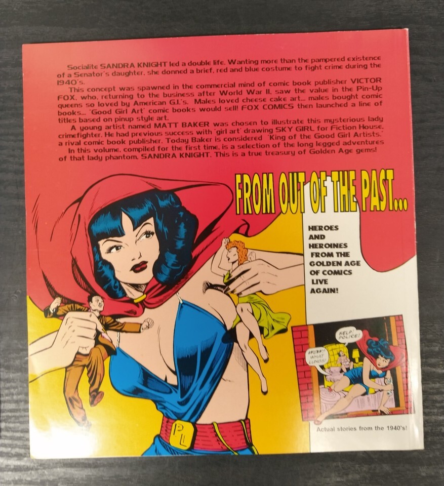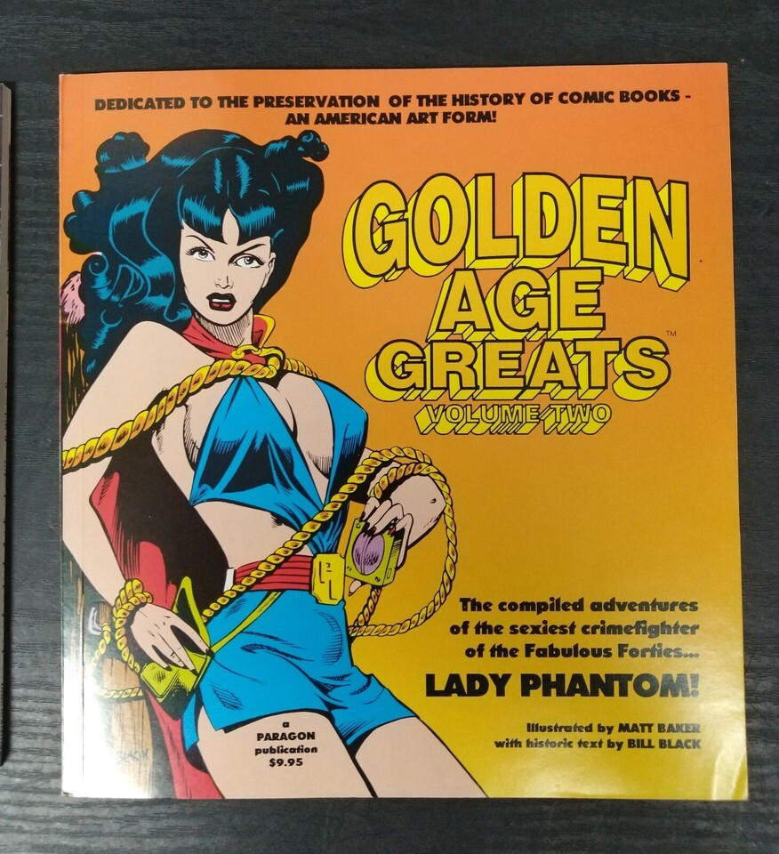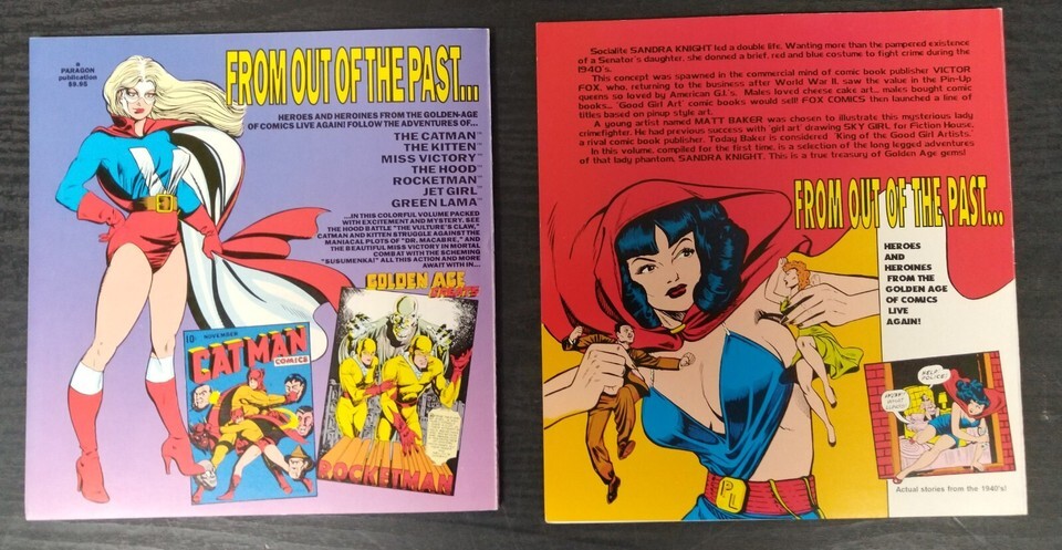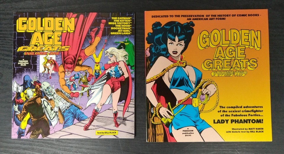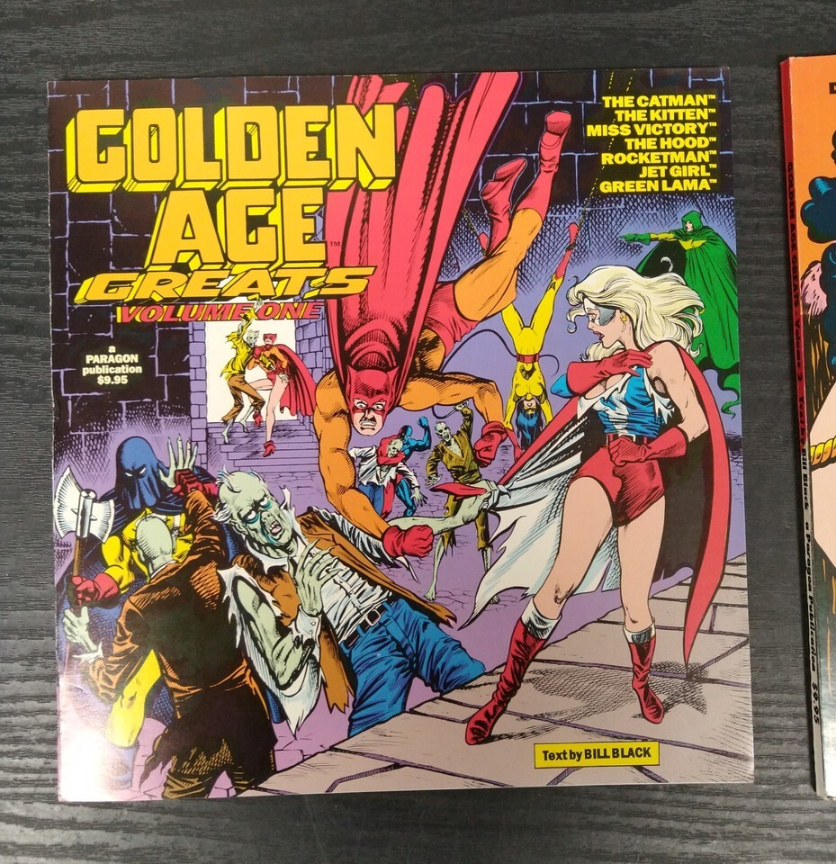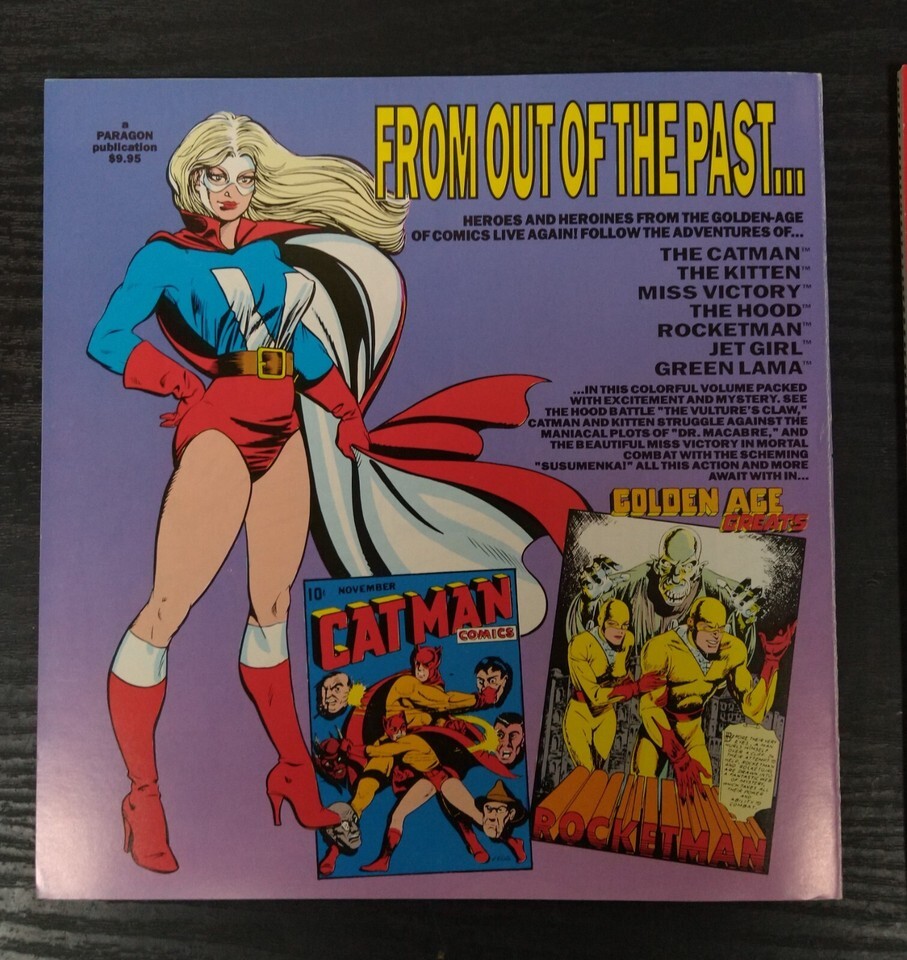 Golden Age Greats (1994), is published by Paragon Publications. The Heroes and Heroines from the Golden-Age of comics live again. Follow the adventures of the Catman, the Kitten, Miss Victory, the Hood, Rocketman, Jetgirl, and Green Lama. Along with heroes the villians of the era return, rouges such as Dr.Macarbe, the Vultures Claw, and Susumenka. Text by Bill Black. 80 pages, color cover with black and white illustrations, 8-in x 8.20-in.