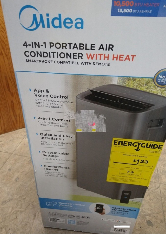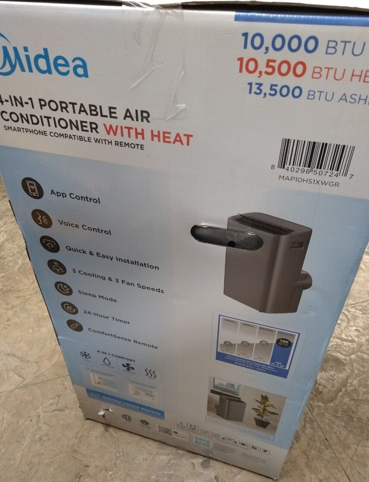 The Midea 10,000 BTU (13,500 BTU ASHRAE) Smart Portable Air Conditioner with Heat will keep you feeling cool all summer long and keep you warm throughout the fall and spring with supplemental heat. With multi-season comfort, this unit cools, ventilates, dehumidifies, and heats a space up to 450 Sq. Ft. With multiple cooling modes, fan speeds and intelligent features such as sleep mode and the 24-hour programmable timer, you can personalize your comfort to match your cooling needs. This unit is very easy to use with the digital display and included remote control. This Portable AC can also be controlled from anywhere with the SmartHome app. Enjoy hands-free voice control when paired with Alexa and Google Assistant devices. With the 4-wheel portable design, you can easily move this unit from room-to-room. This unit requires external venting through your window. Easily install in casement or vertical sliding windows with the included installation kit. This unit comes with a 1-year limited warranty.