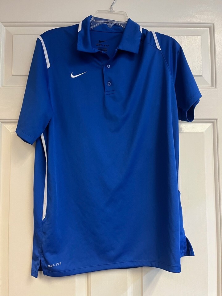 Men?s Nike Dri?FIT Victory golf polo in royal blue with white accents, size medium. Moisture?wicking Dri?FIT fabric helps keep you cool and dry on the course or for everyday wear, with a classic polo collar and short sleeves. Shirt is pre?owned but in excellent condition with no noticeable flaws; see photos for close?ups of logo, collar, and hems.