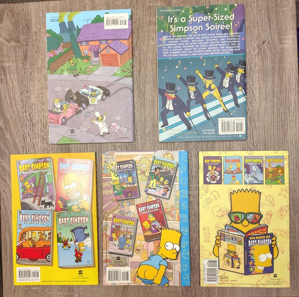 Condition: Used. This is a set of five softcover graphic novels. The books show varying degrees of shelf wear on the edges and spines. All in great condition except for Big Bratty Book of Bart Simpson which has some pages loose.