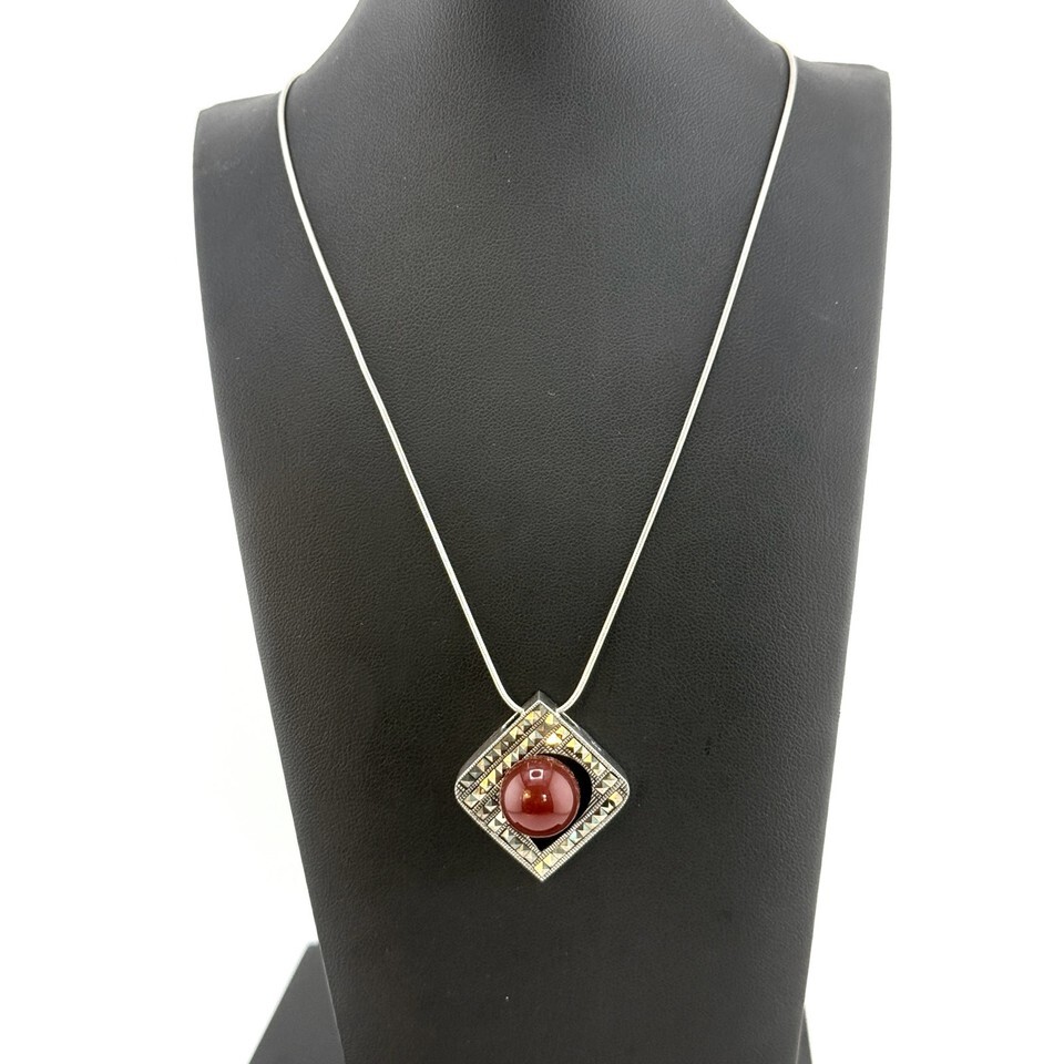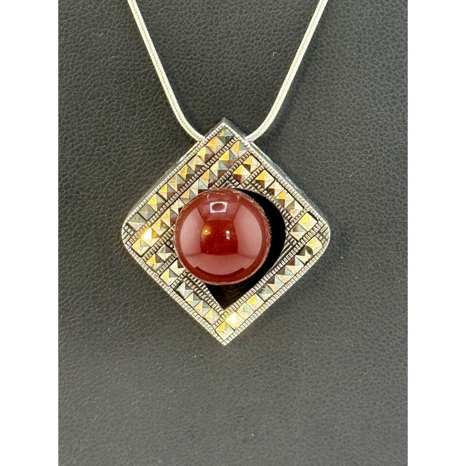 A GIFT BOX AND BAG WILL BE INCLUDED WITH EVERY ITEM PURCHASED DURING THE HOLIDAY SEASON.Stunning and unusual globe shaped carnelian stone mounted on a marcasite pendant. The 925 sterling silver chain is 22 inches. A lovely and unusual vintage piece to add to your collection.