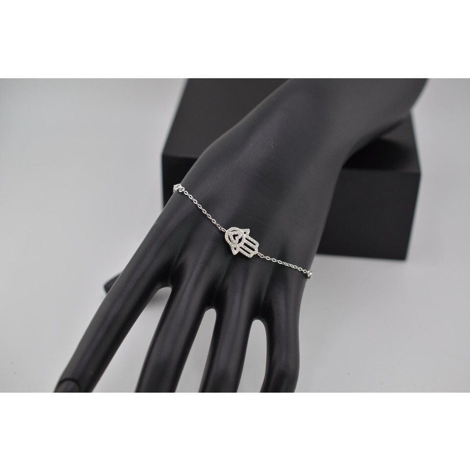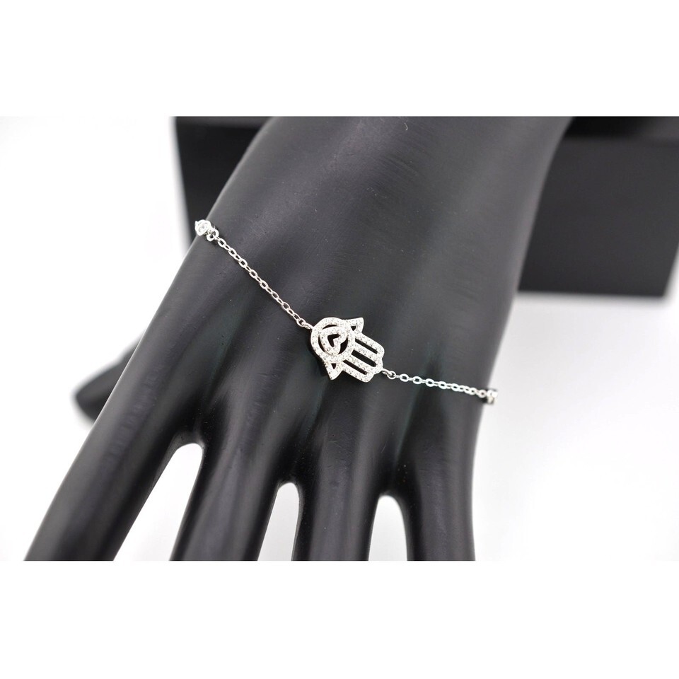 Beautiful Moroccan 925 Sterling Silver Hamsa Eye of Fatima Crystal Bracelet. This bracelet is a stunning piece of jewelry that combines cultural significance with elegant design. Crafted from high-quality 925 sterling silver, it features the Hamsa hand, a symbol of protection and good fortune. Sparkling crystals add a touch of glamour and sparkle, making it perfect for both everyday wear and special occasions. Adjustable from 7" to 8.25". Weighs 2g. Add a touch of mystique and positive energy to your style with this exquisite bracelet!