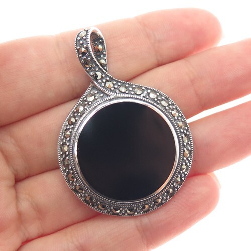 Vintage Marcasite 925 Sterling Silver Onyx Pendant Necklace