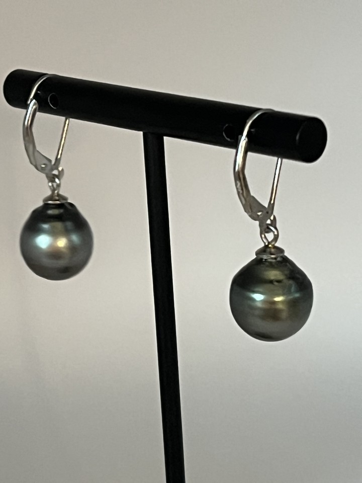 A GIFT BOX AND BAG WILL BE INCLUDED WITH EVERY ITEM PURCHASED DURING THE HOLIDAY SEASON.Add a touch of elegance to your outfit with these lovely spring-closure earrings. These are genuine black Tahitian Pearls measuring 8-10mm. Size will vary. Measuring 1.5 inch long and 0.5 inches wide, these earrings are the perfect size to make a statement without overwhelming your outfit, perfect for those who love vintage and antique jewelry and are looking for a unique addition to their collection. Whether you're dressing up for a special event or just want to add some shine to your everyday look, these earrings are sure to impress.Stop by our Shop and see all the Sale Items.