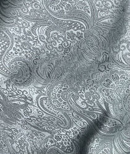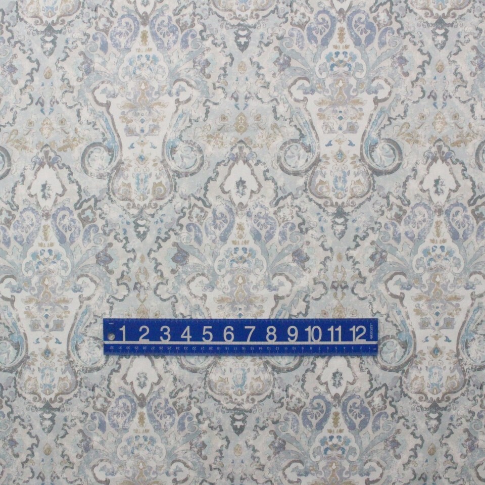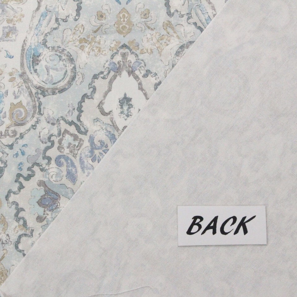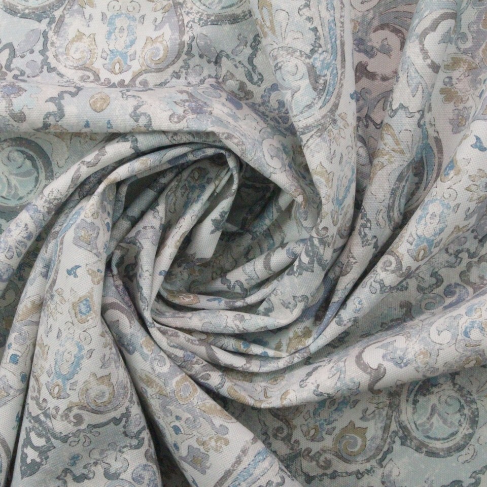 A ROMANTIC VINTAGE DAMASK IN TONES OF MINERAL, SPA, GRAY, TEAL, AND IVORY PRINTED ON SUPPLE 100% COTTON.