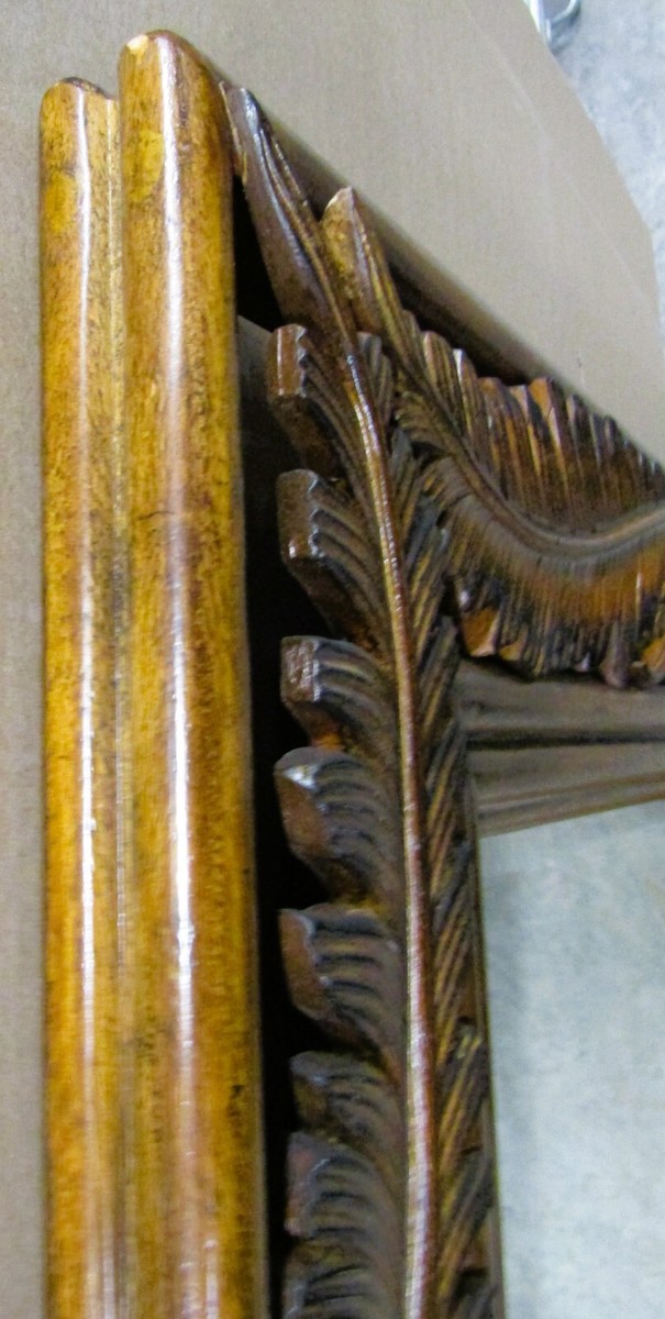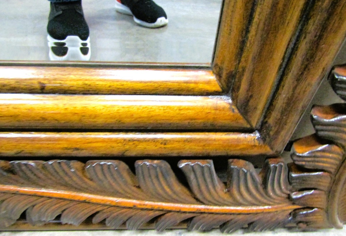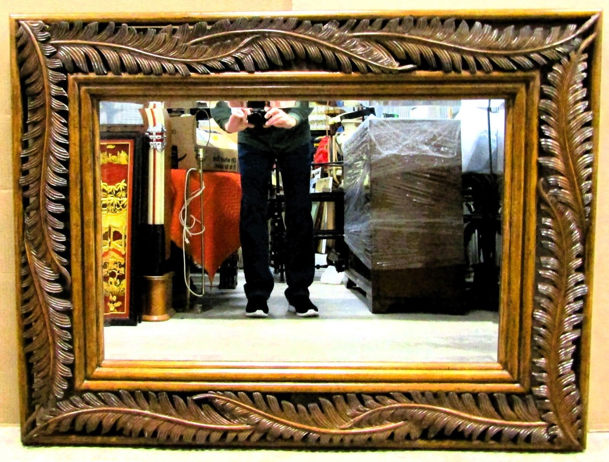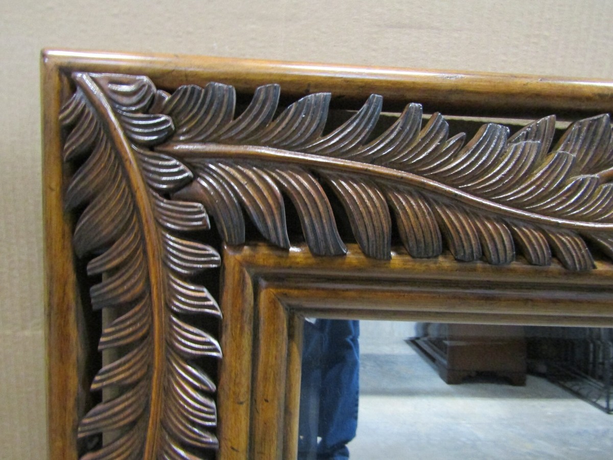 This landscape mirror features a wood framed palm frond motif. It can be used vertically or horizontally to create a unique look.