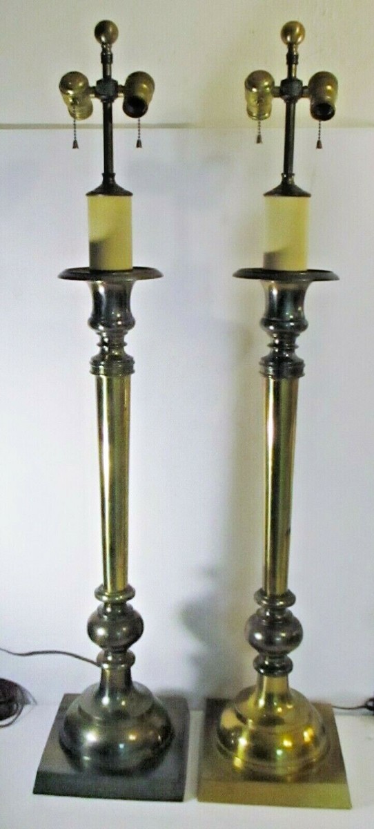 Matching Pair of Chapman 40" Brass Candlestick Buffet Lamps Hollywood Regency