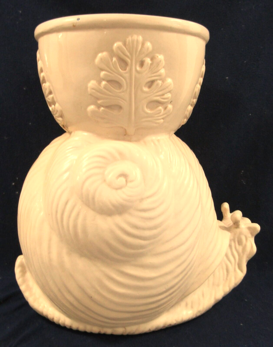 This Palm Beach/Hollywood Regency style planter, crafted in fiberglass, showcases a charming snail-shaped design. It features a smooth, glossy pale yellow finish with intricate detailing on the snail's shell and oak leaf accents that elegantly wrap around the planter bowl. With its playful yet sophisticated aesthetic, this piece is suitable for the garden, patio, or even indoor spaces. The generous bowl size makes it perfect for displaying plants or flowers. Marked at the base DR7.