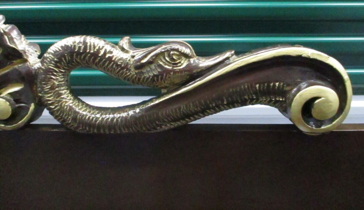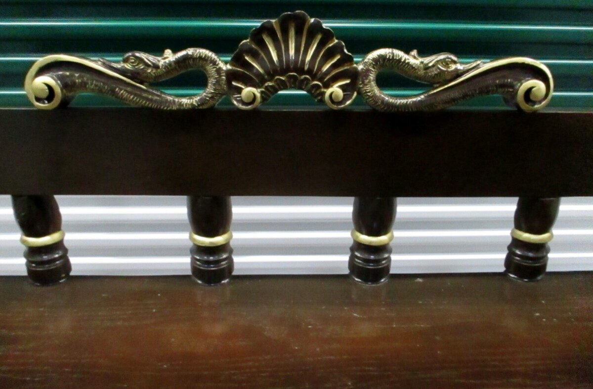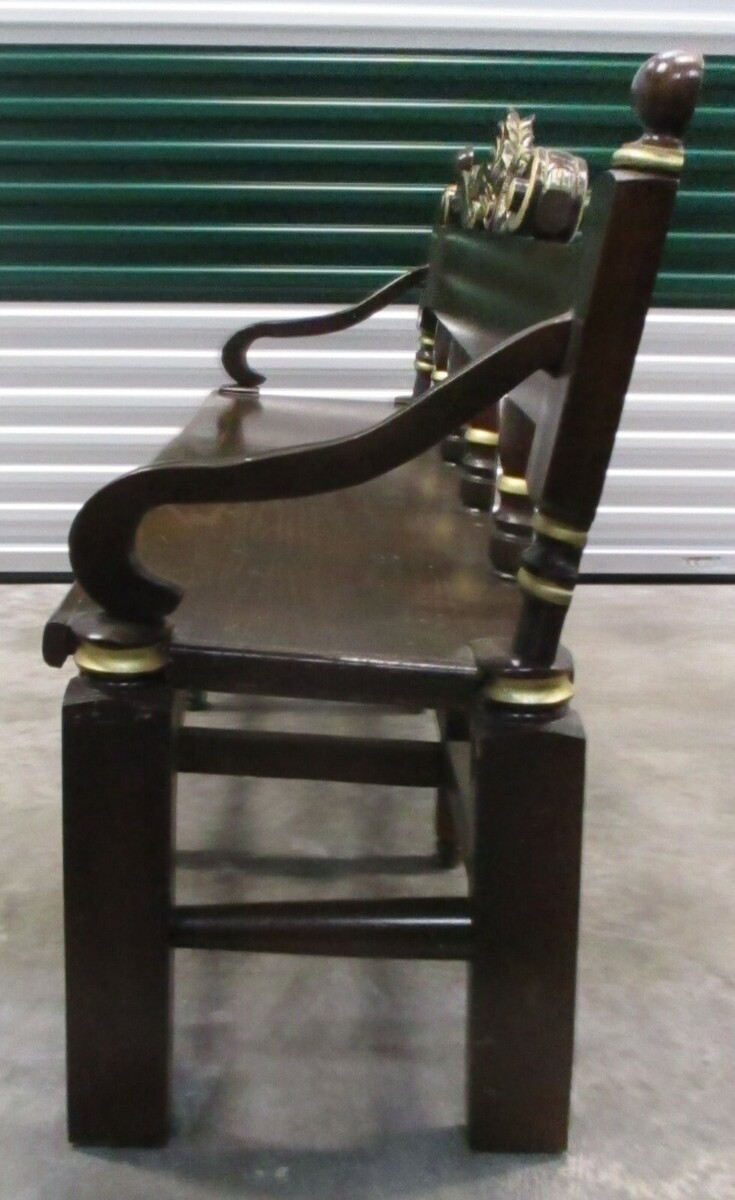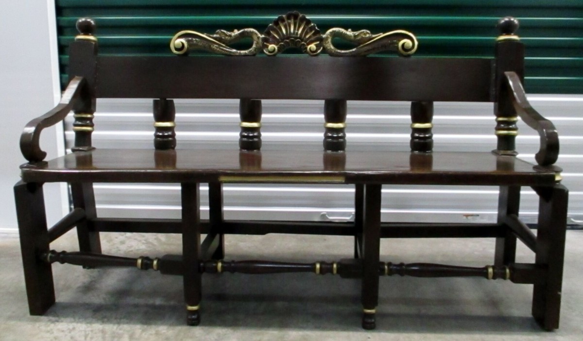 Antique Three Seat Ornate Carved Wooden Bench Black Gold Dolphins Shell Design