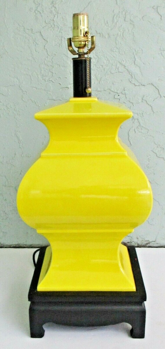 This bright yellow Mid Century Chinoiserie style table lamp is in the shape of an Oriental jar or urn. The lamp is made of ceramic with a bevelled black wood base with a gold colored metal base. Full working order with harp and shade.