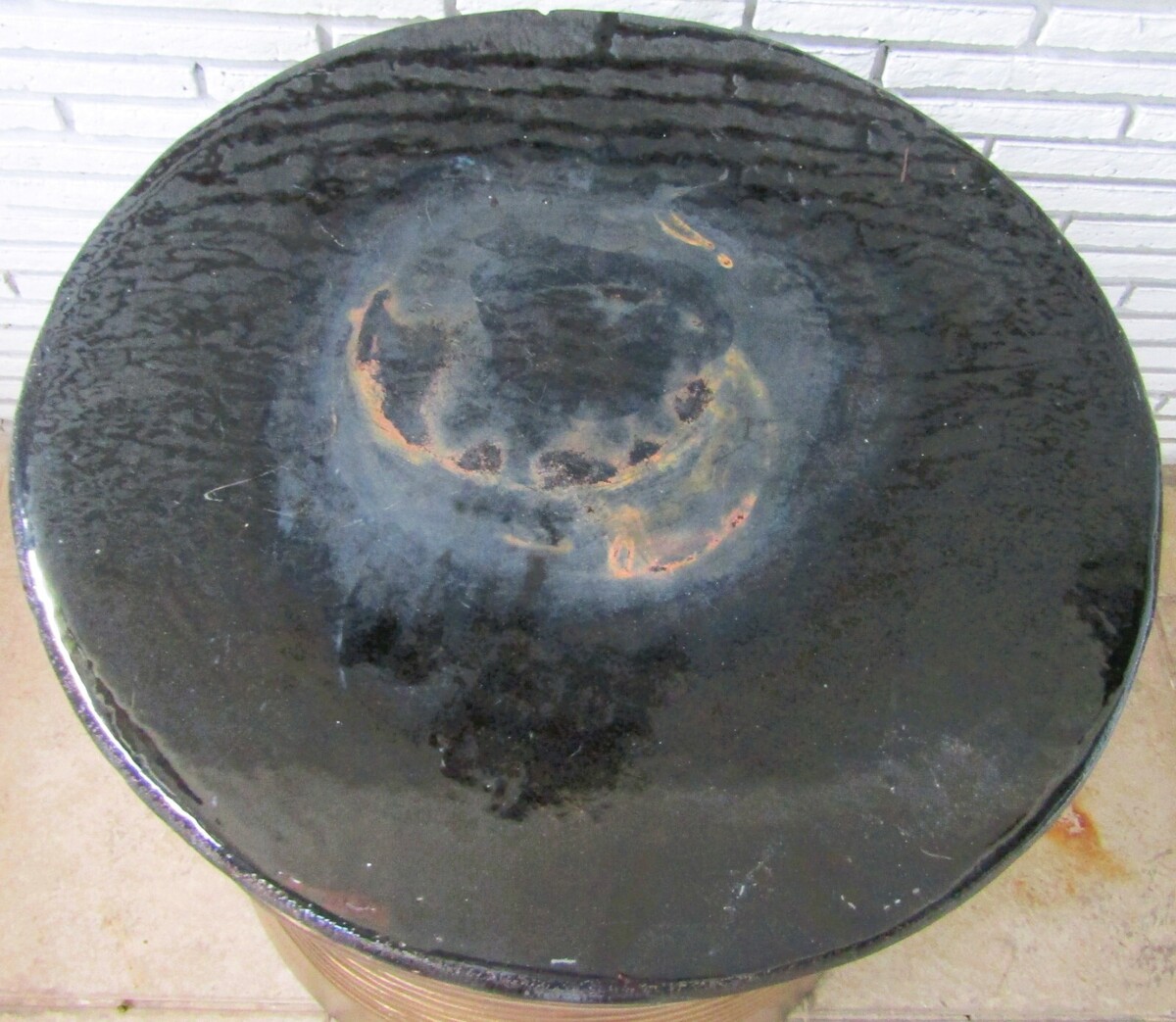 Vintage Asian Bronze Rain Drum Gloss Black Terra Cotta Top Side Table