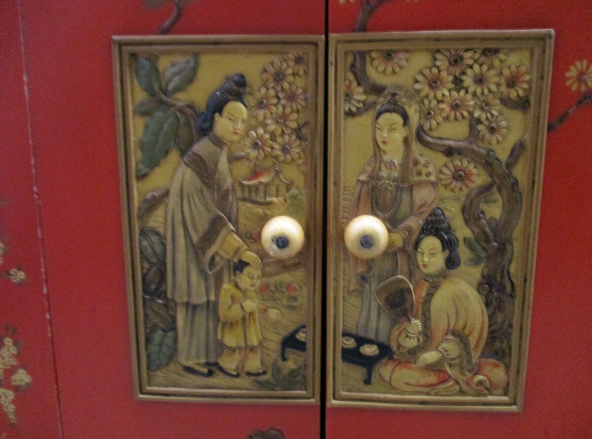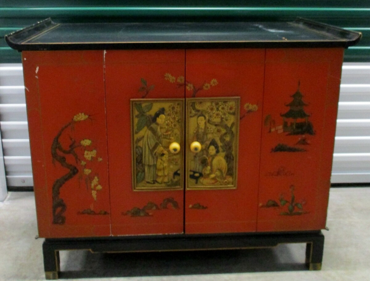 Asian Zenith TV Cabinet; Has Black Painted Top with Gold Trim and Rounded Edges. Has 2 Red Lacquer Bi Folding Front Doors With a Painted Oriental Scene by Ann Cousino.