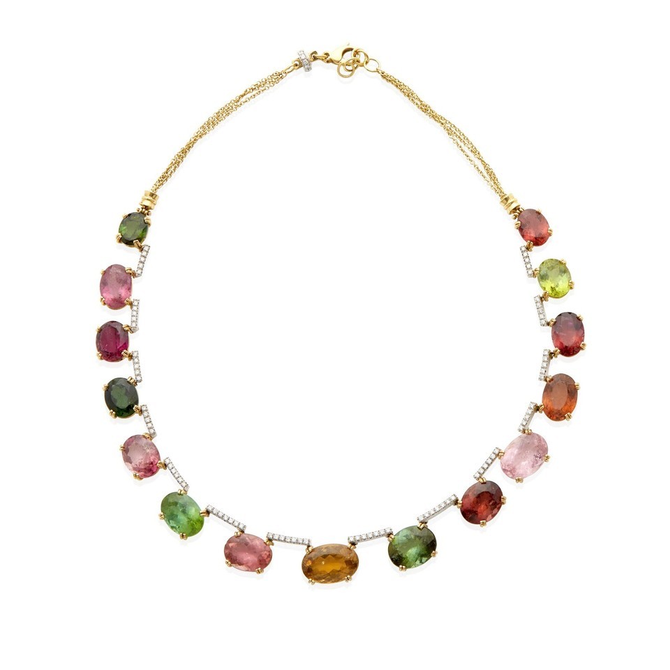18k Gold 115 ct Multicolor Tourmaline and .8ct Diamond Riviere Necklace 17 3/4"