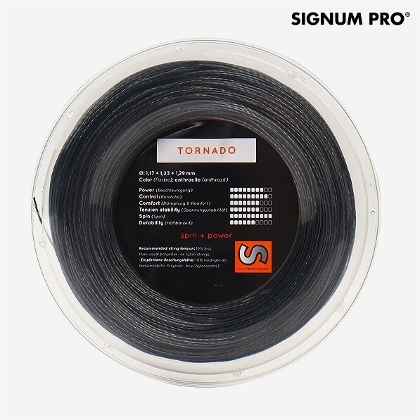 Main Features : ---Brand : Signum Pro ---Sports : Tennis ---Model : Signum Pro Tornado 1.17/1.23mm 200m ---Dimension : 1.17mm (17L GA) / 1.23mm (17 GA) ---Length : 200 m ---Color : Black