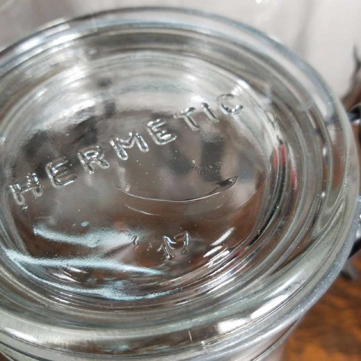 They are a canning style jar with a glass lid, metal closure, rubber seal and a modern graphic design. Each lid has the word Hermetic in the glass.