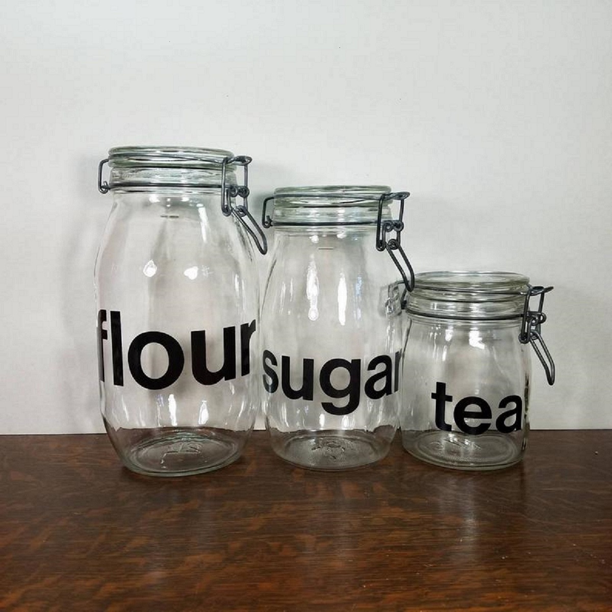 This set includes: flour, sugar, tea. Each canister is labeled for its contents with large modern lowercase black letters.