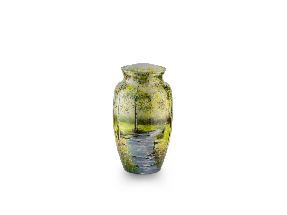 Babbling Brook Adult Urn is a hand-painted memorial urn featuring a peaceful forest scene with a gently meandering stream flowing through a calm morning landscape, evoking tranquility and reflection. Crafted from 100% aluminum, this urn offers durability while showcasing fine artistic detail. It includes a threaded, airtight screw-on lid to ensure contents remain securely in place and comes with a complimentary velvet carrying bag. Hand painted in and imported from Viet Nam, the Babbling Brook Adult Urn is a serene and meaningful tribute to a life well remembered.