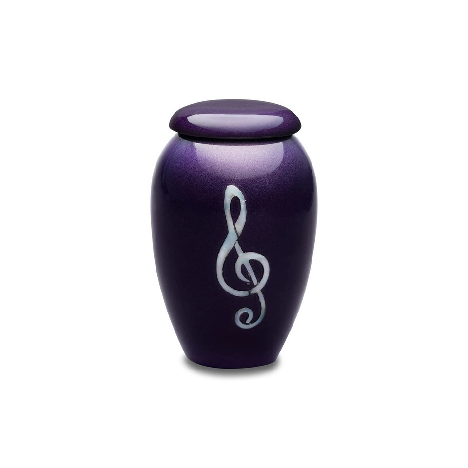 Deep Purple Token Urn showcases a musical clef elegantly inlaid with real mother of pearl on a rich purple-colored urn. Designed as a memorial keepsake rather than for full internment, it has a 3 CI capacity. Each token comes with a velvet carrying pouch and a threaded, airtight screw-on lid to keep its contents secure. Crafted from durable aluminum, it offers a beautiful and lasting tribute.