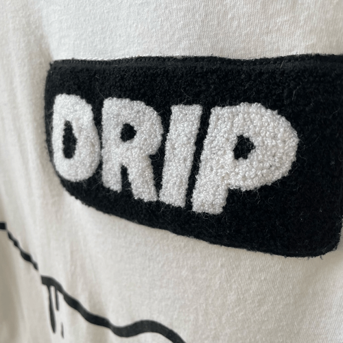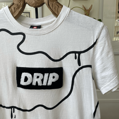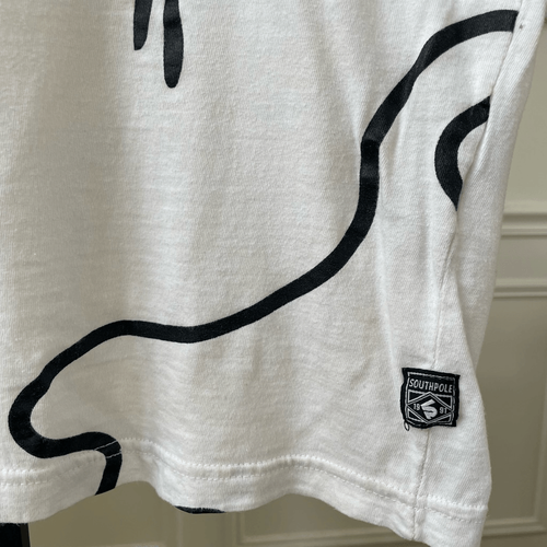 Men?s South Pole Drip short sleeve T-shirt. 100% cotton. Black scribble on white with a raised varsity letter bouquet style ?Drip? applique on the front. Measurements are approximate and taken while laying flat: 26 inches shoulder to hem and 19 inches armpit to armpit.