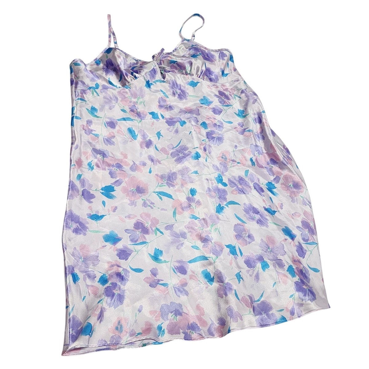 Keywords: satin slip, floral print, cami nightie, boudoir, feminine, dreamy, lightweight, loungewear, vintage inspired, cozy, shimmery, adjustable straps, 90s, Y2K, retro