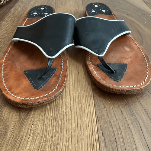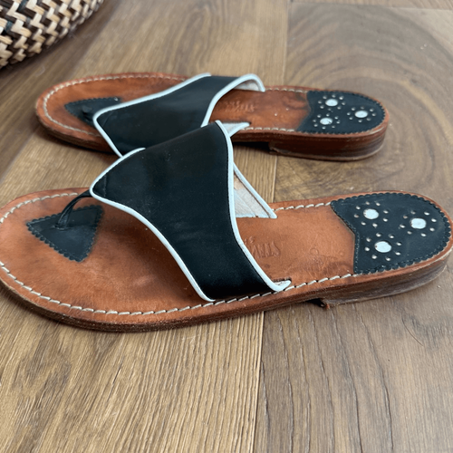 Steven Salario black leather slip on flat sandals with white piping trim. Good quality leather. Size 9.