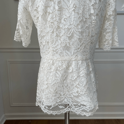 Neiman Marcus women?s short sleeve lace full zip short sleeve cardigan top that could be worn by itself when zip shot or paired with a Cami as a cardigan. Jewel neckline and short sleeves that are online. The bodice is lined. Peplum cut. Measurements are approximate and taken while laying flat: 26 inches shoulder to hem, 17 inches armpit to armpit and 15 inches straight across the waist when zipped closed. Coquette feminine