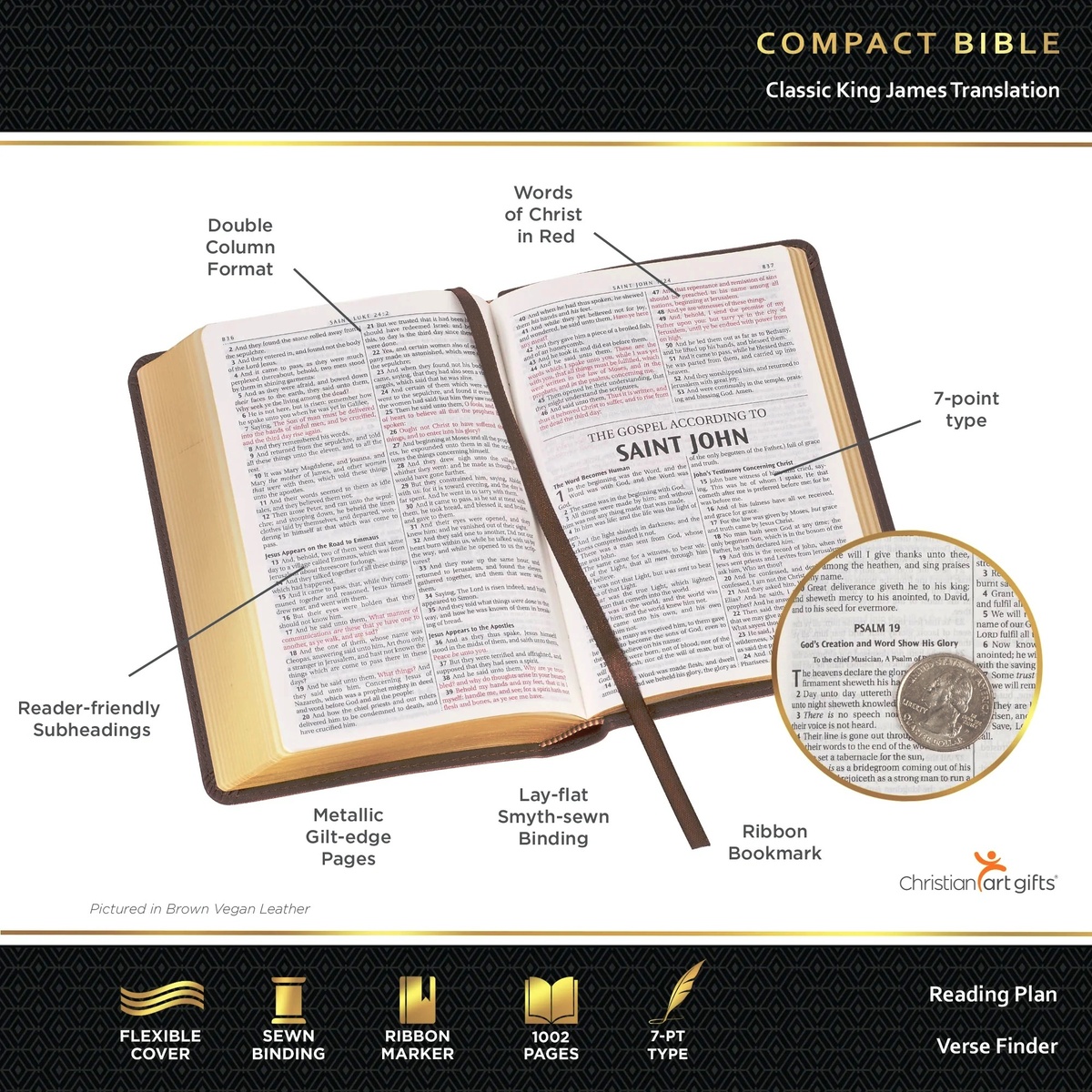 KJV HOLY BIBLE, COMPACT, BLACK FAUX LEATHER, KING JAMES VERSION, RED LETTER EDITION, RIBBON MARKER, ZIPPER CLOSURE.
