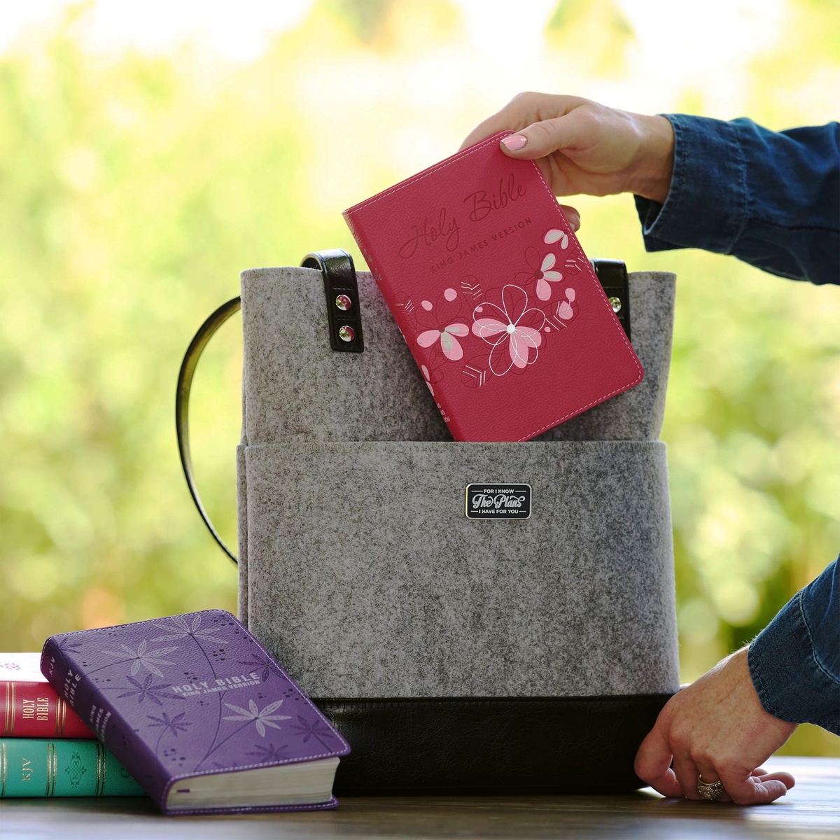 This Black Faux Leather KING JAMES VERSION HOLY BIBLE with zippered closure is the perfect bible to slip into a purse! The zippered closure protects the pages inside the Bible so they will not fold or tear. The black faux leather back panel of this Bible features an uninterrupted heat-debossed quatrefoil design. The panel wraps around the spine and connects to a smooth front panel that holds the silver-foiled title and version reference. The edges and seams of this KING JAMES VERSION HOLY BIBLE are reinforced with black topstitching. Silver gilt-edged pages complement the silver-foiled title and a black satin ribbon marker is included to save your place. A sturdy black zipper with a silver pull closes you Bible securely. This Bible opens flat for easy reading and, once opened, you will find reader-friendly subheadings, a double-column format, words of Christ printed in red ink, a thematic Scripture verse finder, and a one-year Bible reading plan.