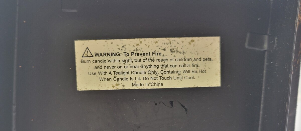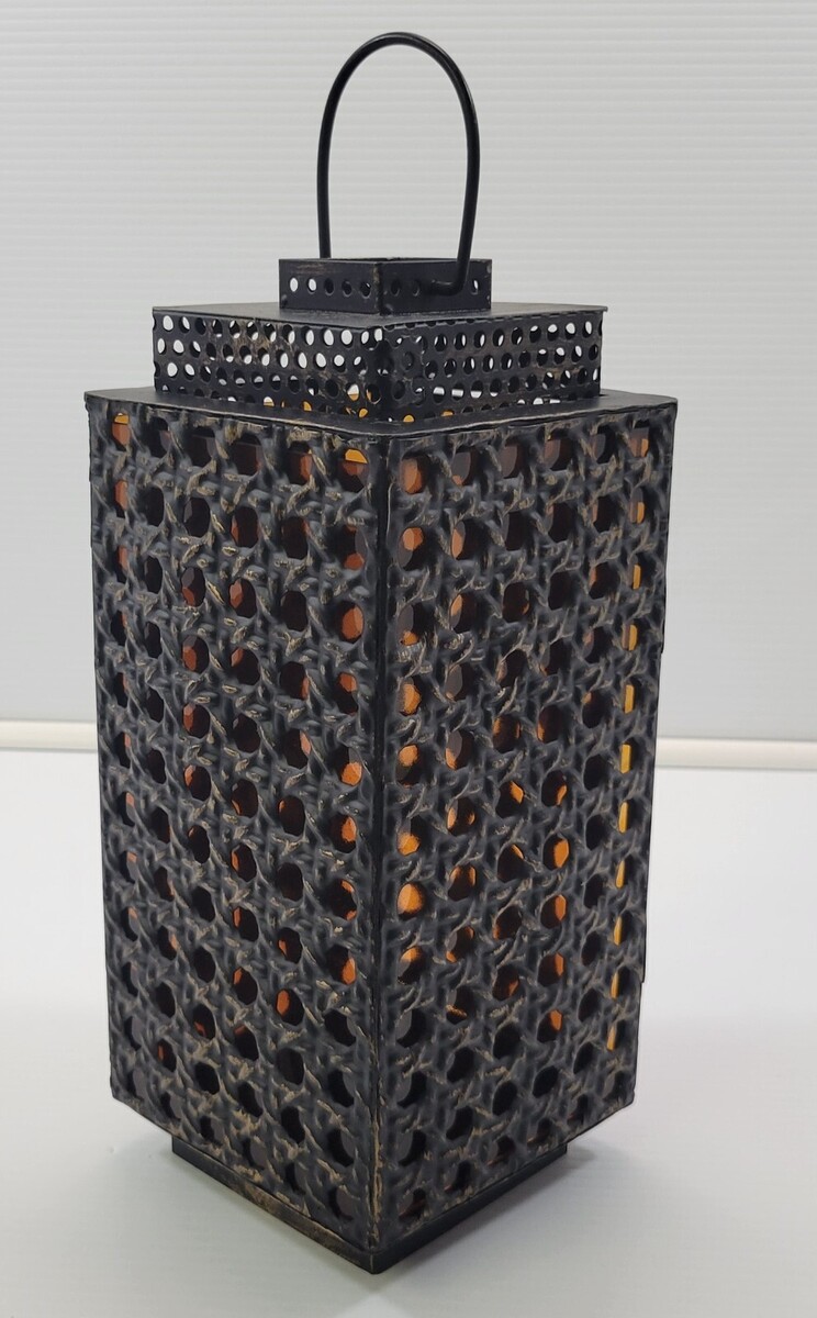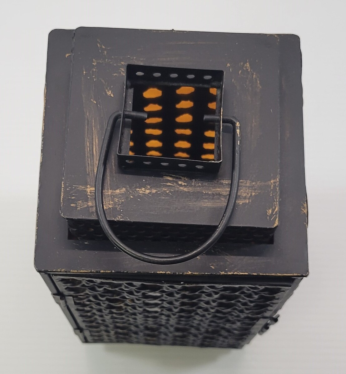 Lantern is in very good, very slightly used with a battery operated candle. Factory rustic design and look.