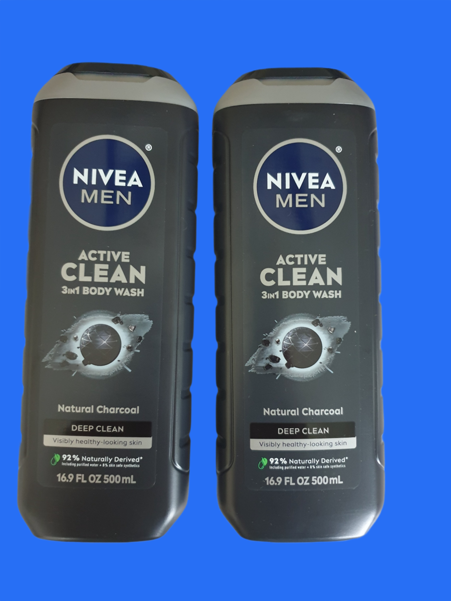 Nivea Men Active Clean 3-in-1 Body Wash Natural Charcoal 16.9 Fl Oz (Pack of 2).