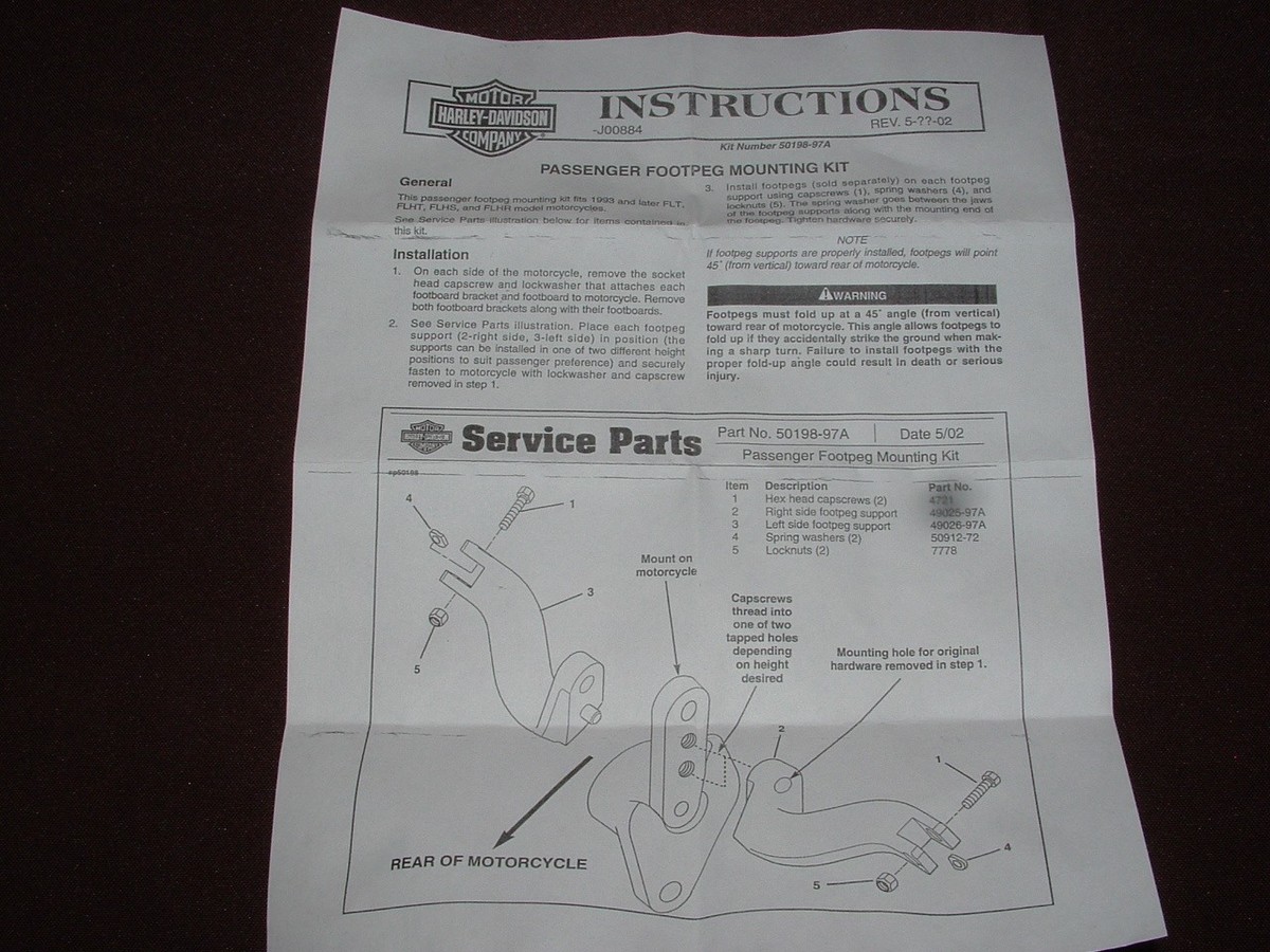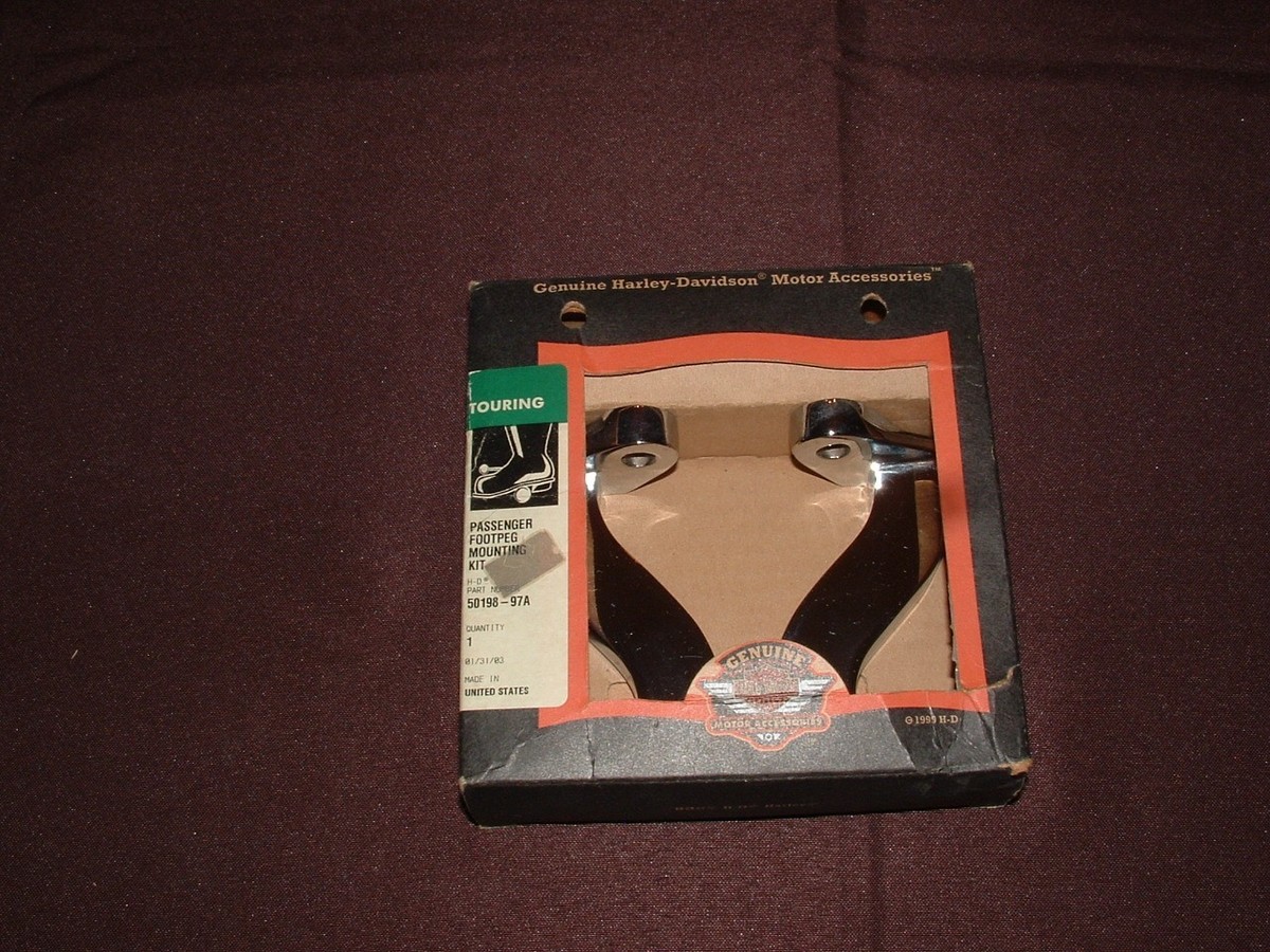 Harley passenger footpeg mounting kit. Part number 50198-97A. Fits 1993 and up FLT, FLHT, FLHS, and FLHR. How far up in model years this will fit I do not know. Google should help with that or your dealer. New chrome kit never installed. Package shows shelf wear. Comes with install instructions. FREE shipping to lower 48.
