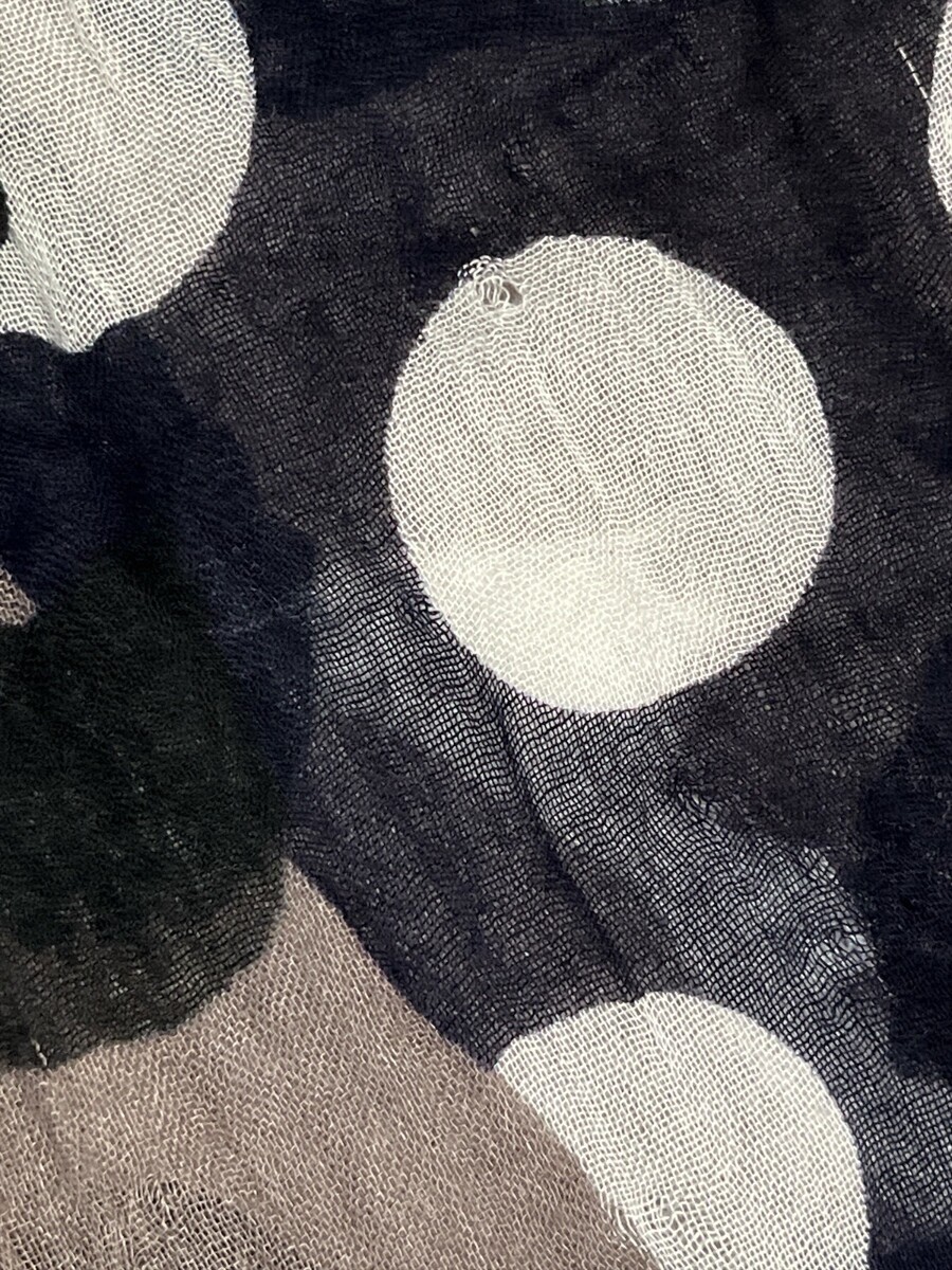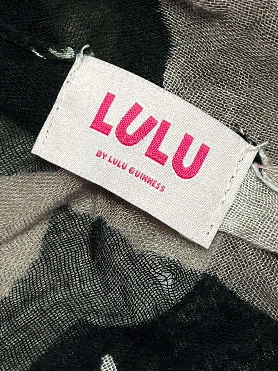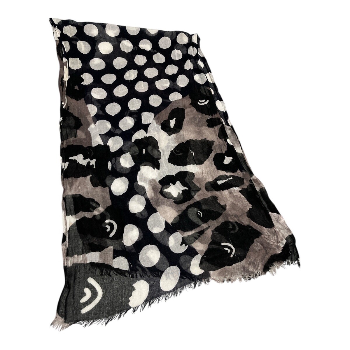 Oversized lightweight scarf by **Lulu Guinness** featuring an abstract face motif layered with oversized polka dots. Designed in a sheer black, gray, and white palette with softly frayed edges for an artistic, relaxed look. Versatile piece that can be worn as a scarf, wrap, or light shawl, adding graphic interest to both casual and dressed-up outfits.