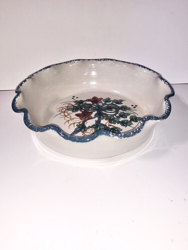 Vtg Deep Dish Pie Casserole Dish Sponge Floral Pottery Ruffle Edge Signed