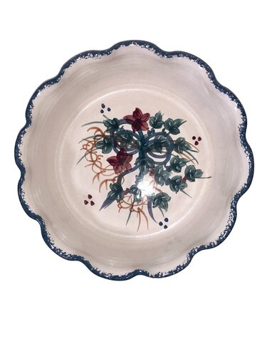 This vintage deep dish pie casserole dish is a handmade piece of stoneware featuring a floral pattern with a ruffle edge. It is signed by the artist and was manufactured in 1999 in the United States. The multicolor dish has a round shape with a diameter of 9 inches and a depth of 2.25 inches. The farmhouse style pie casserole dish is decorated with hand-painted floral artwork, making it a unique and charming addition to any kitchen or dining table.