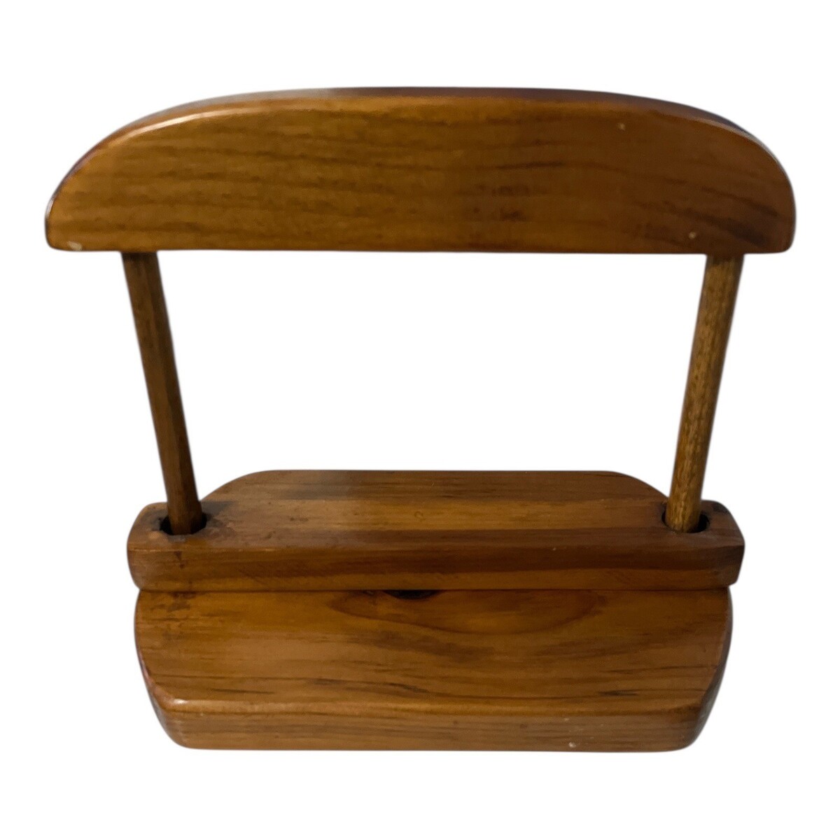 Handcrafted solid wood napkin holder. Warm natural wood grain with smooth rounded edges and dowel supports. Bottom is hand-signed and dated ?MG Smith 4-13-79,? indicating artisan-made workmanship. A functional and decorative piece for your kitchen or dining room