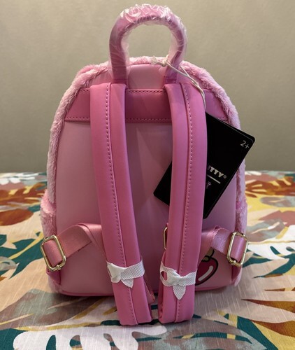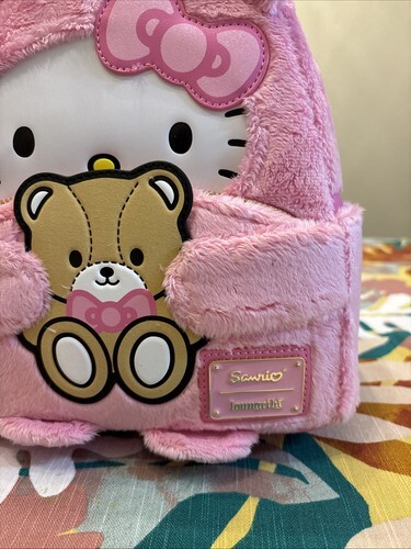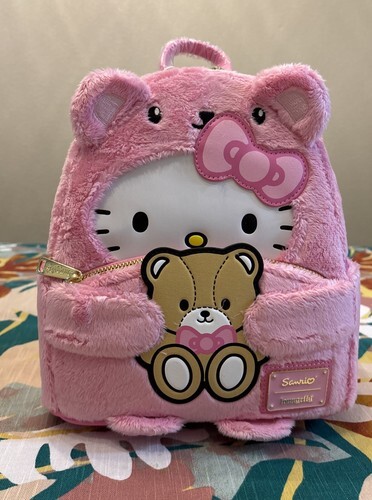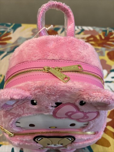 Say hello in beary sweet style. Take along our exclusive Loungefly Hello Kitty Plush Bear Mini Backpack. This adorable accessory features soft pink plush on the front and side pockets. It appears that Hello Kitty has donned her pink bear hoodie outfit, and she looks comfy and cozy. Her applique plush arms, on the front zipped pocket, wrap around an applique teddy bear, and her signature pink bow frames her face. Pink plush bear ears poke up over the top, and embroidery brings the face of the pink bear on the hoodie to life. On the back, Hello Kitty?s teddy bear makes an encore appearance with a heart. Share smiles wherever you go with this heartwarming accessory. Item ships brand new in sealed package with tags.
