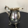 Vintage silverplate pitcher featuring an ornate handle and decorative feet.