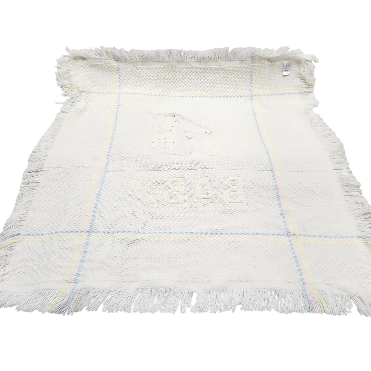Stork Club Baby Blanket White Acrylic Knit Fringe Giraffe Bear Bunny Italy VTG